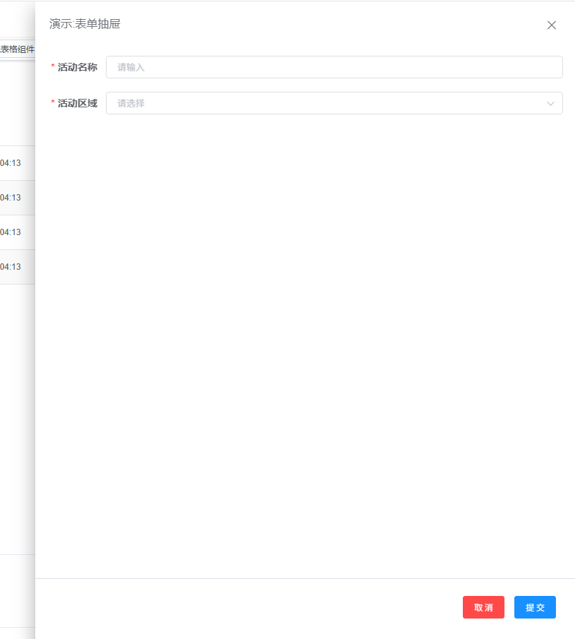 <cute-form-drawer ref="drawerFrom" :model="createFormModel" :rules="createFormRules" title="演示:表单抽屉"